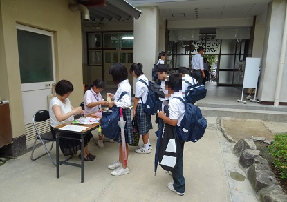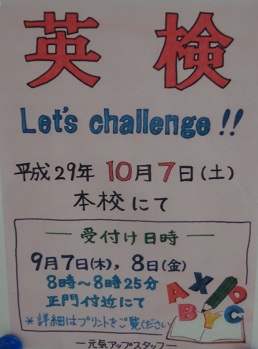 昨日は各小学校で英検の受付を行いましたが、今日は、中学校で受付を行いました。明日9月8日(金) も中学校の玄関付近で英検の受付を行ないますので、受検希望者は申し込みをしてください。