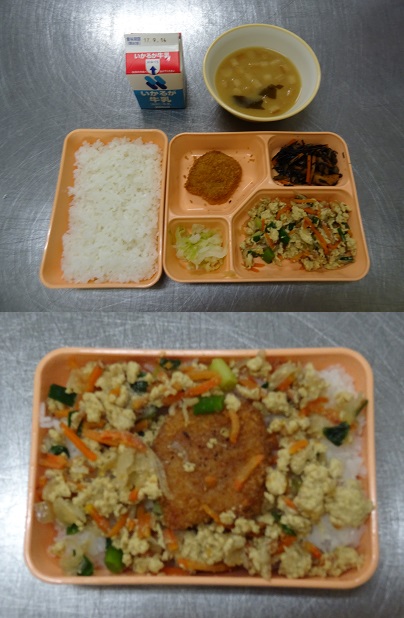 本日のメニュー:かつ丼(一口とんかつ)、ひじきの煮もの、