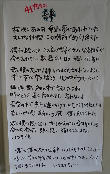 41期生の課題曲は「絆」です。新中で築いた「絆」を合唱練習を通じてさらに強めて欲しいと思います。