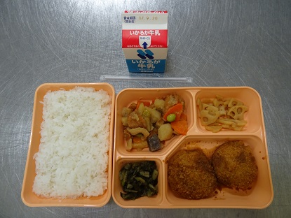 本日のメニュー:みそかつ、赤平天とじゃがいもの煮もの、れんこんの