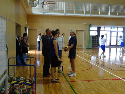 写真上段は、全校集会で自己紹介をしている様子です。中段は、体育館で引率・随行で本校を訪問された校長や副校長との雑談している様子です。下段は、4時限目に行った理科の実験の様子です。