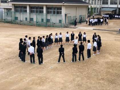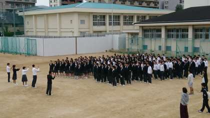 合唱コンクールは3連休明けの来週火曜日に行われます。写真上段は、各クラスの朝練の様子です。中・下段は、3年生参加生徒全員で課題曲「絆」を合唱している様子です。早くからグランド歌声が満ち溢れて、とても優雅な気分になりました。