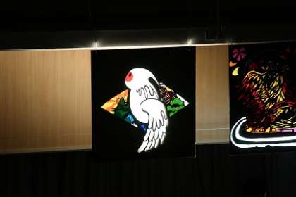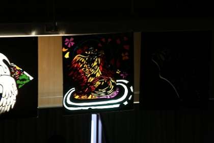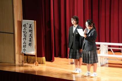 美術文芸部の作品紹介の様子です。体育館の後ろに掲げられた作品にスポットライトを当てて紹介してくれました。