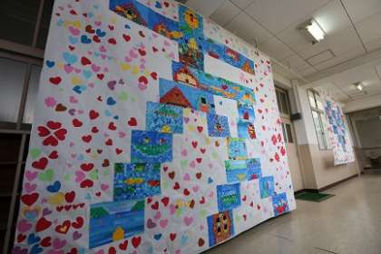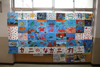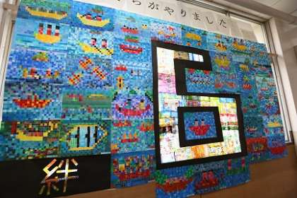 2・3階職員室前に掲示された1年生のモザイクアートです。写真上段は1年3組、中段は1年4組、下段は1年6組の作品です。それぞれの生徒の作品をつなぎ合わせて、クラス作品に仕上げてくれました。とても素晴らしい作品揃いでした。