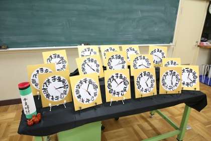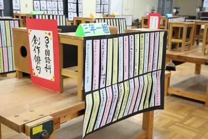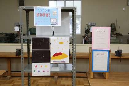 技術室に展示された作品です。写真上段は国語科の創作俳句、中段はパソコン部作品、下段はPTAの干支時計です。