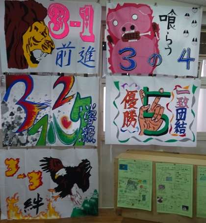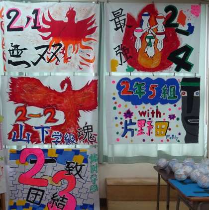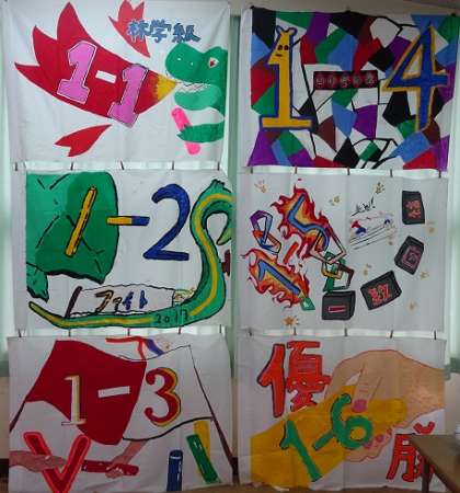 1階音楽室に展示されていた「学級旗」です。この学級旗は、6月の体育大会で使用しています。
