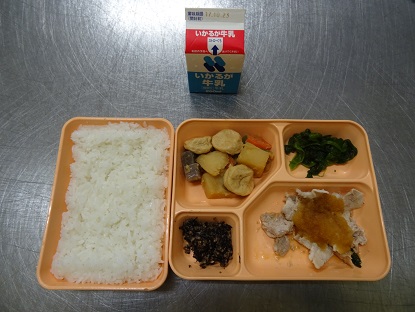 本日のメニュー:豚肉のおろしじょうゆかけ、一口がんもとじゃが