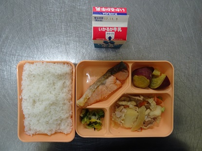 本日のメニュー:豚肉と野菜の煮もの、鮭の塩焼き、ふかしいも、