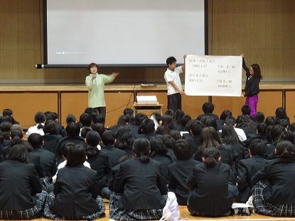 1年生の防災の取組みは、11月18日の防災研修に続いて、本日の防災教育です。12月13日(水)には、阪神淡路大震災で父親を亡くしボランティアで東北へ行った女性の夢「20年分のありがとうを伝えたい」と題して、小島 汀(おじまみぎわ)さんによる『防災講演会』を予定しています。1年の生徒たちには、「防災研修」「防災学習」「防災講演会」を通じて、『命の尊さ』を学習し、十分に理解して欲しいと思います。