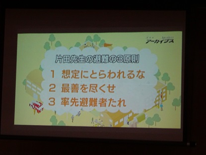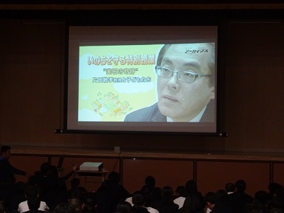 防災学習では、DVD「いのちを守る特別授業 “釜石の軌跡” 片田敏孝教授と子どもたち」により、釜石の軌跡を起こした片田教授が提唱する津波避難三原則(1想定にとらわれるな、2最善をつくせ、3率先避難者たれ)を通して、自然災害が発生し、遭遇した時に「自分の命を守るのは自分自身であること」、「地域の働き手は中学生であること」を学習しました。