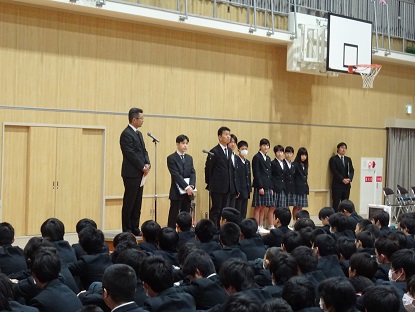 その後、生徒指導主事からは地域の人々に迷惑をかけない。迷惑をかけているつもりはなくても、周りの人々から指摘されたら「すみません」と謝って、速やかに行動を改めるようにと注意がありました。続いて、自分を大切にしてください。一人で悩まずに周りの大人に話をしてください。周りの大人に話をしにくい場合は「24時間子どもSOSダイヤル」などを活用して、命を大切にしてください。というお話がありました。