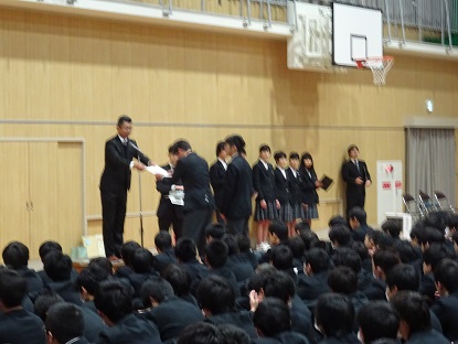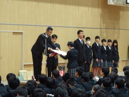 本日、2学期を締めくくる終業式が体育館で行われ、最初に部活動で頑張ったラグビー部員やテニス部員、そして、大阪府小中書道コンクールの入選者、平成29年度東淀川区人権週間に関わる標語の入選者などに表彰伝達が行われました。