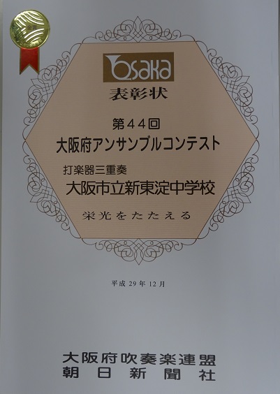 昨日12月26日(火)に八尾市文化会館プリズムホールにて開催された「第44回 大阪府アンサンブルコンサート」において、打楽器三重奏部門で、「金賞」に輝きました。本校吹奏楽部は、3年連続で金賞を獲得しました。