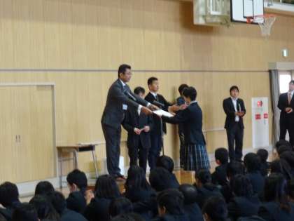 校長先生からは、3学期の始まりに当たって、「初心、忘るべからず」についてのお話と、「プロ野球日本ハムの大谷翔平選手が、自身の夢(二刀流)の実現や「縁」を大切にして移籍先を決定したこと」を例に挙げられて進路決定のあり方などについてお話がありました。最後に「3学期もいいスタートを切って、残り3カ月を頑張ってください」と励ましのことばがありました。