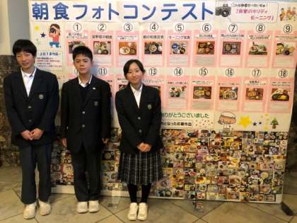 大阪府学校給食会主催の朝食フォトコンテストにおいて大阪府内21校、641作品の中から本校1年生3名が入選し、表彰されました。入選作品は栄養バランスや食べやすさなど様々な工夫を凝らした献立で食べたいなと感じさせる素晴らしい作品でした。入選作品以外にも素晴らしい作品がたくさんありました。