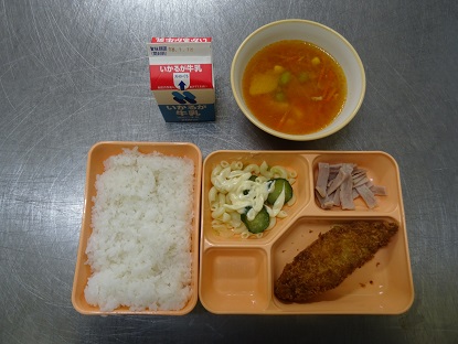 本日のメニュー:ミネストローネ、枝豆、白身魚フライ、マカロニ