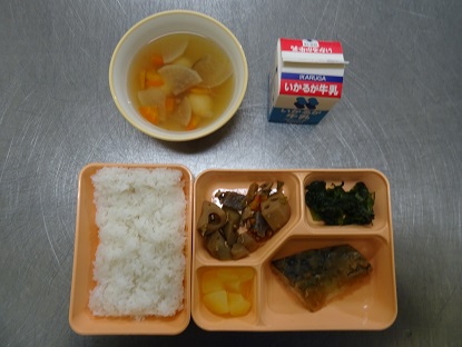 炒め、りんご缶詰、のっぺい汁、米飯、牛乳