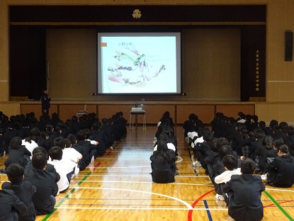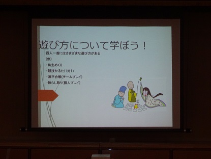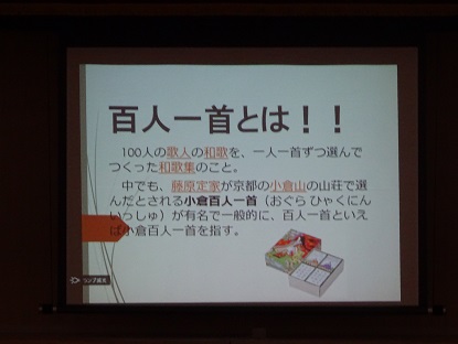 取り組みでは、国語科担当教員から、百人一首は、百人の歌人の和歌を一首づつ選んで作った和歌集ですなどの概略や百人一首の遊び方や百人一首大会のルールの説明がありました。