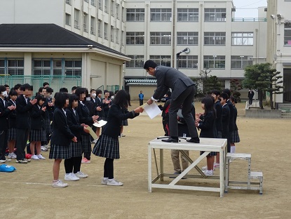 全校集会に先立って、「第13回 大阪市立中学校ソロコンテスト」において、金賞・銀賞を受賞した吹奏楽部の生徒たちに賞状の伝達が行われました。