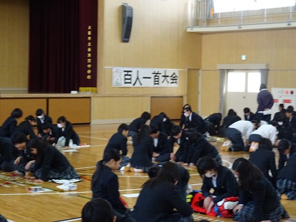 1月24日(水)6限目に体育館で「2年 百人一首大会」を行いました。百人一首大会は、各クラスで予選を行って順位ごとに班分けをし、班ごとに100枚の札を取り合って、獲得した札の枚数の平均によりクラス毎で競争しました。もちろん、読み上げられた札を早く取った枚数ですが、お手つきをした時は、取った札から1枚を場に戻します。