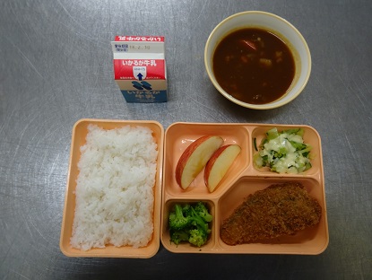 フライ、きゅうりのサラダ、りんご、米飯、牛乳