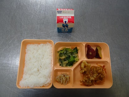 いも、もやしのピリ辛あえ、米飯、牛乳