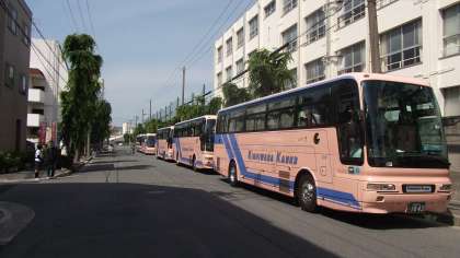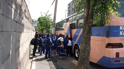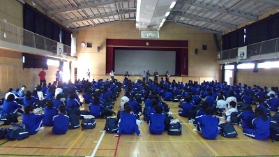 1年生の一泊移住は体育館で「出発式」を行った後、9時25分に「堺市立日高少年自然の家」に向けて元気に出発しました。