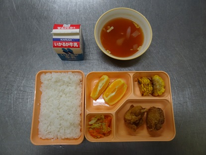 にんじんのサラダ、いよかん、トマトのスープ、