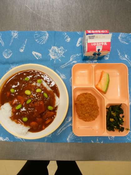 ポークハヤシライス 枝豆 野菜コロッケ ほうれん草とコーンのソテー クインシーメロン 米飯 牛乳