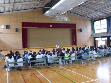 本日、土曜公開授業が行われました。地域、小学校保護者を含む、186名の方々に来校していただきました。終了後、保護者懇談会(1年、2年)、進路説明会(3年)が行われました。特に「第1回進路説明会」では、「進路の考え方」「中学校卒業後の進路」「進路決定のしくみ」「学費とその補助制度」について、進路指導主事から説明がありました。緊張のなかで、進路に向けてのスタートを切りました。