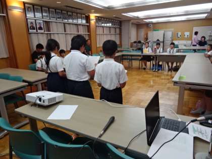 7月30日(月)本校多目的室において、菅原小学校・新庄小学校・下新庄小学校の児童会の皆さんと、本校生徒会執行部のメンバーで、毎年恒例の交流会を行いました。