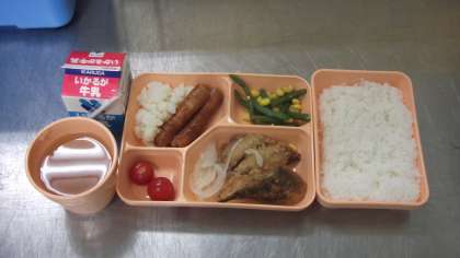 今日のメニューは、「鯵のレモンマリネ」(写真右下)、「フランクフルトのマスタードソース」(写真左上)、「粉ふきいも」(写真左上)、「三度豆のソテー」(写真右上)、「プチトマト」(写真左下)、「スープ」(写真左側)でした。