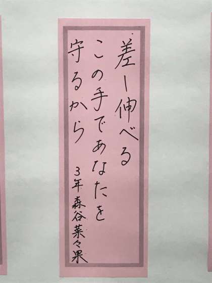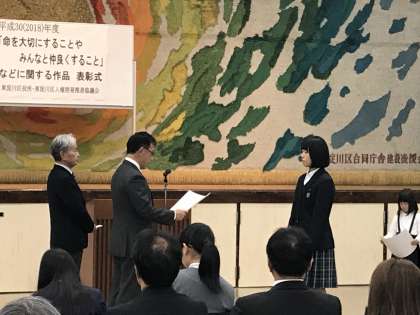 12月17日(月)、東淀川区民ホールにて、東淀川区人権啓発推進協議会による人権標語についての表彰式があり、本校第3学年・森谷菜々果さんの作品が、優秀作品として表彰されました。