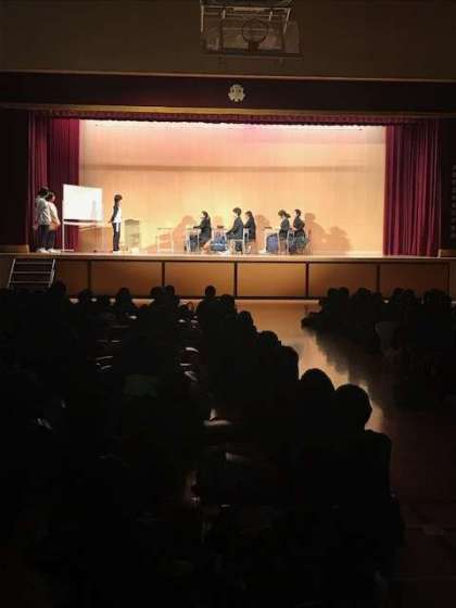 体育館で、生徒会・演劇部合同による『中学校生活の紹介』劇を観た後、各自希望の部に分かれて部活動体験をしてもらいました。