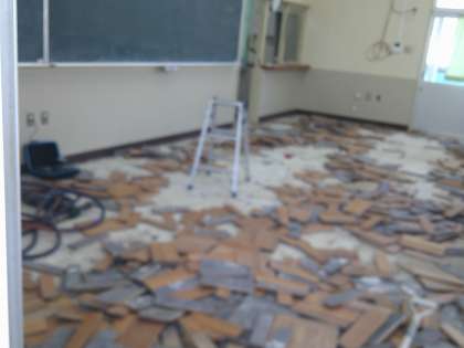技術室床の、張り替え工事の様子です。
