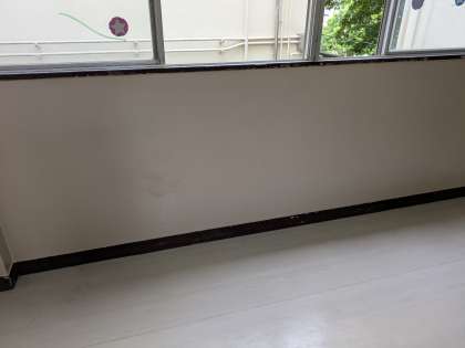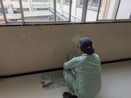 廊下では、管理作業員さんによって壁面補修をしていただき、2階のトイレ前が綺麗に整えられました。