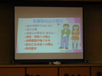 講師の先生にお越しいただき、スライドを活用して分かりやすく「性」についてお話していただいています。