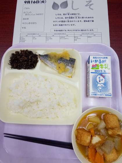 今日の給食には、「さごし」「おろしじょうゆ」「含(ふくめ)め煮」「そぼろ」等、ちょっと普段使わない語句が少なくないですね。