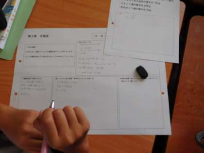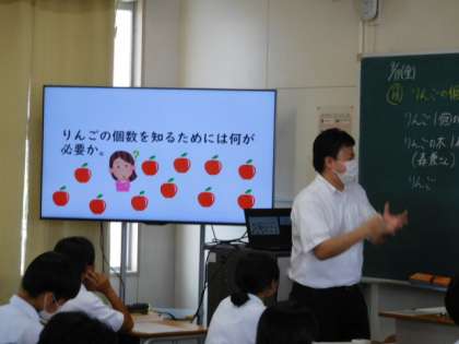 1年5組では「りんごの個数を数えずに求めるには、どうすればよいでしょうか」というねらいをもとに、方程式の考え方をみんなで学んでいく授業でした。グループに分かれて話し合いながら、授業が展開されていました。