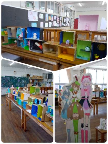 写真は美術室の美術部、2年生美術科の展示発表です。