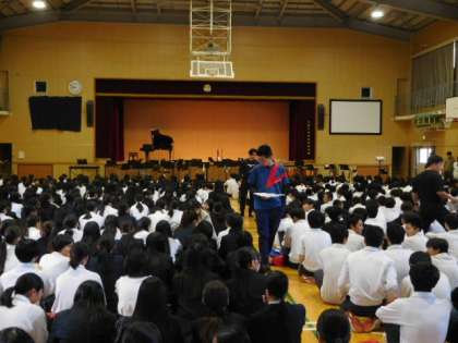 本日は、来る11月1日(土)の「創立50周年記念式典」に向けての全体合唱の練習のため、本日の全校集会は体育館で開催されました。
