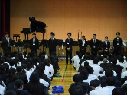 まず、校長先生との挨拶の後、教育実習生が本日までで終了する予定であり、全校生徒・教職員へのご挨拶をいただきました。