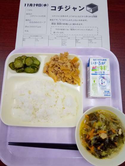 今日の給食では「きゅうり」が使われていますが、もやし、ほうれん草、にんじん、ぜんまい、切り干し大根、海藻など、季節や地域によって様々な食材が使われているのだそうです。