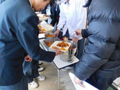 教室前に一人ひとり並び、給食当番に配膳してもらって自分の席で「いただきます」を待ちます。