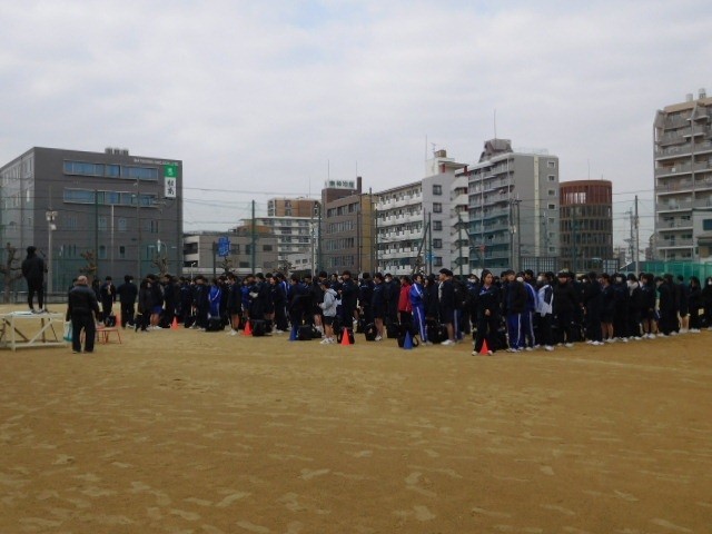 女子からスタートするので、女子、男子とクラスごと淀川河川敷に移動しました。