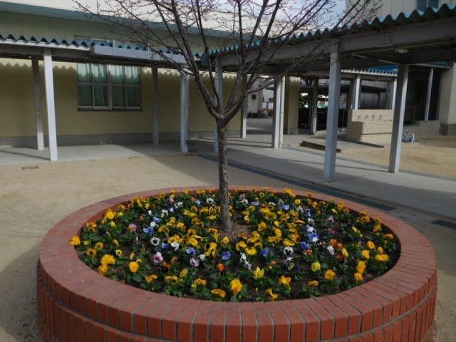 体育館入口の向かいにある、花壇に植えられたパンジーです。