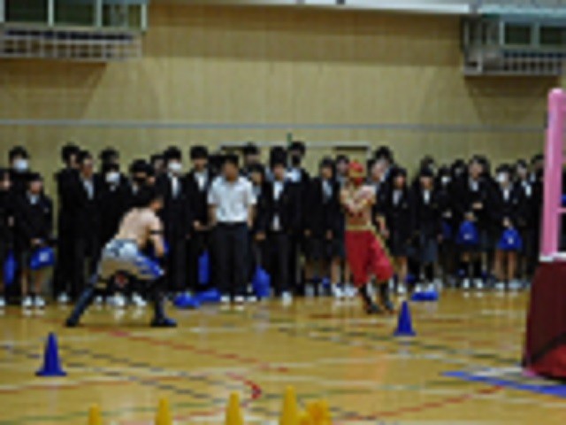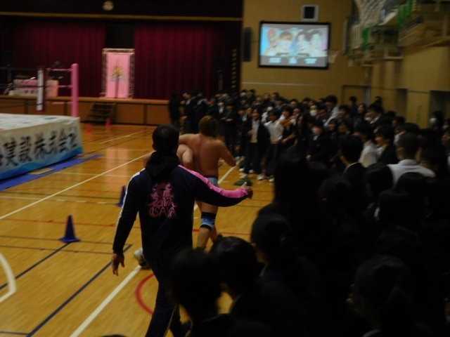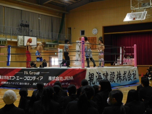 大変な訓練のもと「相手の技をしっかり受け止める」というプロレスの神髄をしっかりと感じさせていただける、そんな素晴らしい試合で、生徒の皆さんも大声で選手を応援してくれていました。
