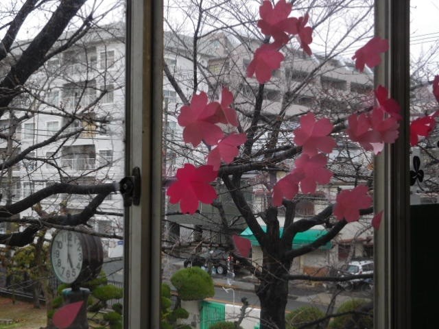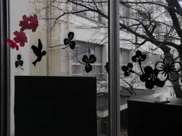 そして図書室前の廊下窓には、春をイメージした「桜」の花びらが飾られていました。