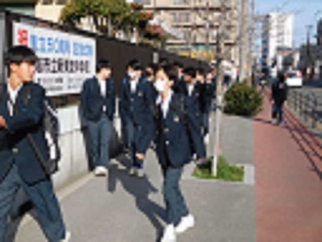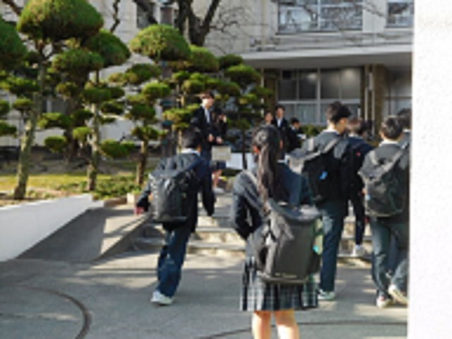 正門を入ったところの庭園は日陰になりますので、寒そうに登校する生徒もいました。