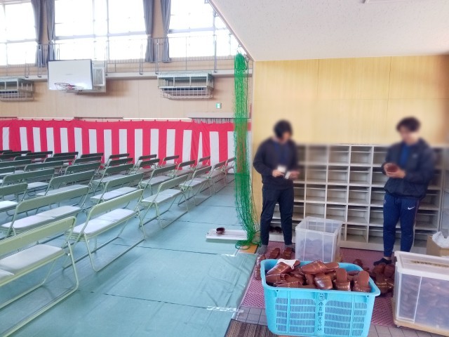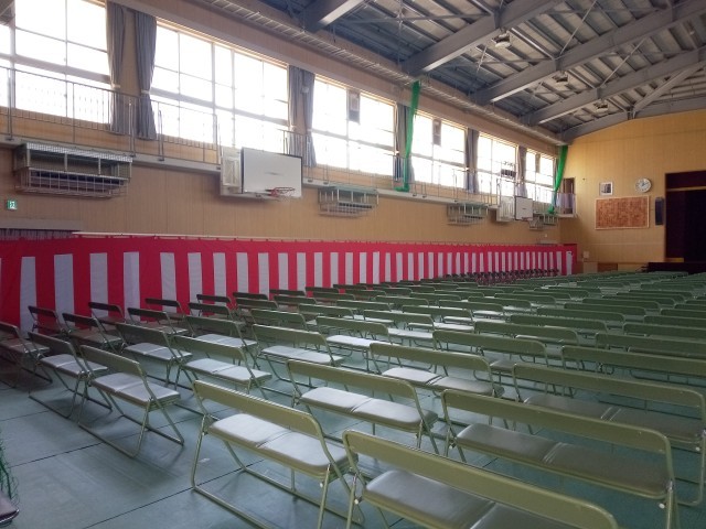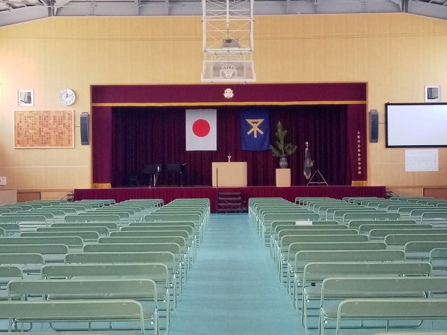 式場ができたら、新入生代表、在校生それぞれの代表生徒が、明日の式典に向けた練習も行います。